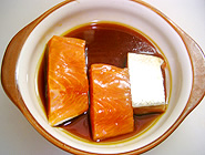 醤油とみりんを合わせた液に、鮭を漬け込み、下味をつける。(できれば1時間くらいは漬けて、味をしみ込ませたいところ。前日から用意してもOK!) |