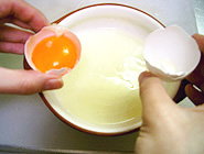 卵は黄身と白身に分けておく。卵を割るときに、黄身を殻の中に残すようにゆっくり割ると、写真のように分かれます♪ |