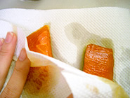 下味をつけた鮭の汁気を、キッチンペーパーなどで拭き取る。 |
