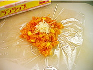 3を4〜6等分にし、ひとまとまりずつラップに広げて真ん中にチーズをのせる。チーズはモッツァレラチーズなら1.5cm各くらいに切って。写真はとろけるチーズ。