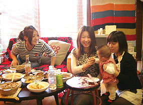 | 今回の料理部員は、左から石塚さん、菅井さん、川原さん。初参加の川原さんは、長丁場の撮影中、7ヵ月の愛娘・咲良ちゃんの授乳を時々はさみながらがんばってくれました(笑)。この咲良ちゃんが、もうかわいくてかわいくて…!! カメラマンさんはじめスタッフ一同癒されまくりの撮影でした☆ |